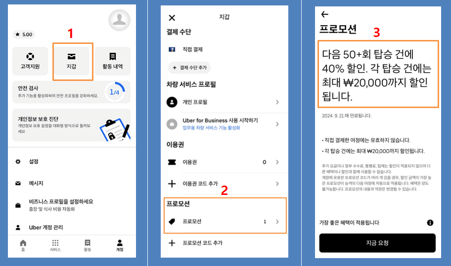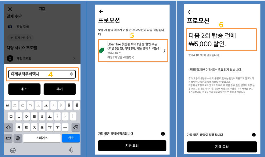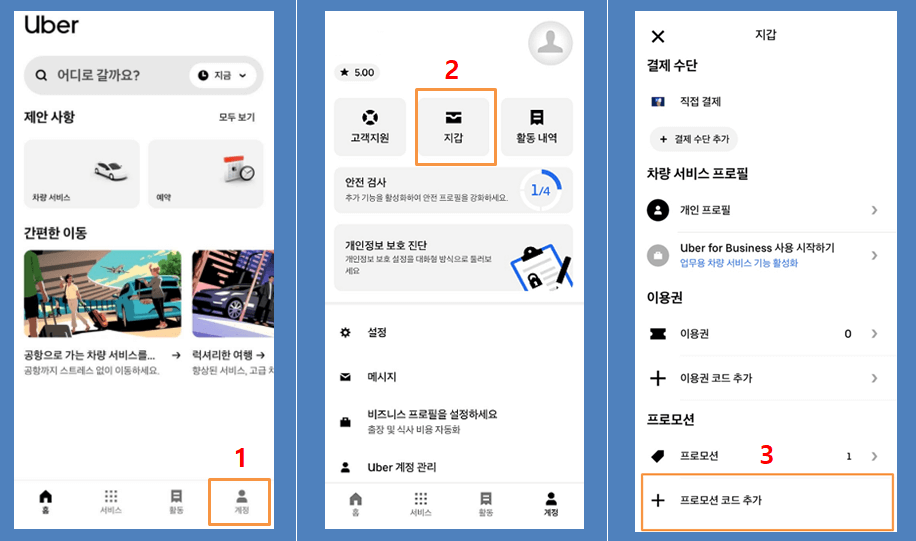 프로모션 코드 등록 방법: 계정 → 지갑 → 프로모션 코드 추가 → 이제부터우버택시 입력