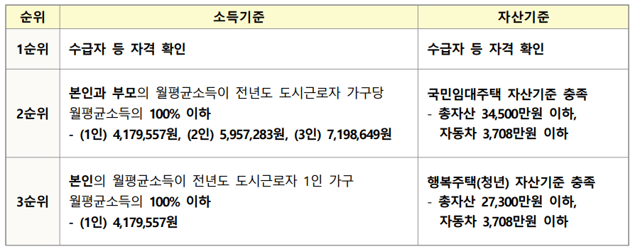 2순위: 본인 및 부모의 소득이 전년도 도시근로자 가구당 월평균소득의 100% 이하(* 아래 표 참조), 자산 기준은 국민임대주택 자산기준에 맞아야 함.